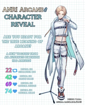 Andy Linh, also known as ANDI or ANRI Arcane♂️, is the official genderbent derivative of ANRI, specifically of ANRI Arcane. He was announced as "a new vocalist from an alternate dimension" and is the newest signee at AO Music (JUN and ANRI's official record label). He was first announced on October 25, 2023, appearing only as a silhouette.[7] Following a "Like" and "Retweet" campaign hosted by AUDIOLOGIE Co., Ltd., his full name "Andy Linh" (a spin on ANRI's full name, "Airi Lin"), official character biography and full illustration were later revealed the same day.[8][9][10] According to his official bio, ANDI is from an alternate timeline and branch of the 'multiverse', Andy Linh, known by his stage name “ANDI” is a 22 year old rapper, singer, songwriter, and multi-instrumentalist. Known for his hypnotic vocals and subversive fashion style that departs from industry norms, ANDI first began streaming his music on SoundCloud in late 2017 while still in high school and garnered attention from multiple record producers. That year, he also signed to a label after being scouted by a multi-platinum record producer and collaborated on a mixtape with him as his protégé. In 2023, after a long hiatus from music and parting ways with his former management, ANDI signed onto AO Music and reprised his role as a singer-songwriter. Once more, ANDI is ready to step in front of the mic and rile up the world with his performance.[11] He was designed by 7Mora and illustrated by the Japanese illustrator, enokiya0 (えのき). He received his first "demonstration", a cover of SPICE! featuring JUN, using a configuration based on ANRI Arcane's "Serious" vocal mode, using the flags +gen 0.260, toneshift 167 cents.[12]