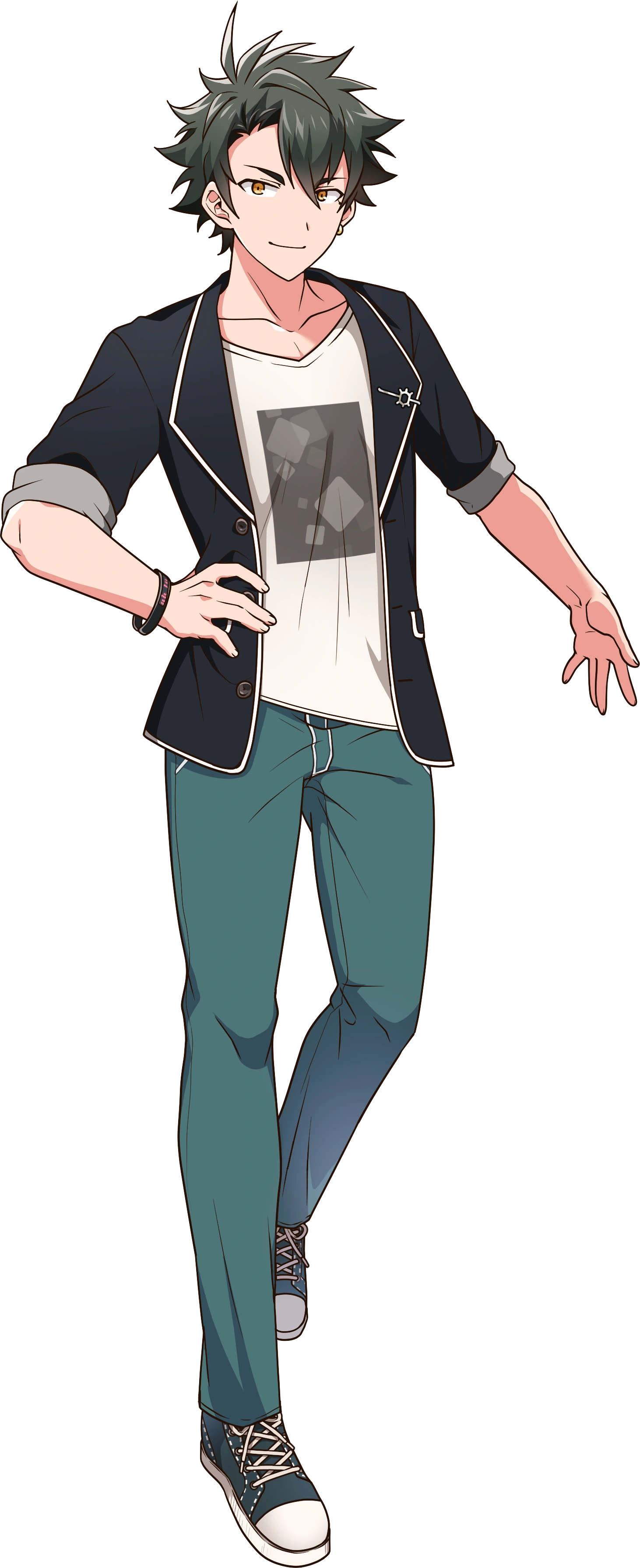 Takuto was introduced as an unknown fifth character who was shown as a silhouette on VirVox Project's website.[41] Small parts of his design were teased in a height comparison illustration of the cast.[42] On April 22, 2022, VirVox project tweeted that Shiki Rowen's exVOICE files mentioned the names of the VirVox Project characters, including the unknown male, confirming it to be "Takuto".[43] He was also included in Shiki Taigen's exVOICE files as "Takuto-kun".[44] On November 7, stats for Takuto were added but his surname was still unknown.[11] On January 28, 2023, the first character of his surname, "瑞", was revealed. His personality was also updated, describing him as a cool and stoic young man who sees Takehiro as his rival. He is not good with women.[45] His full information and illustration were revealed on September 4, and he was released with exVOICE files.[15][46][47]