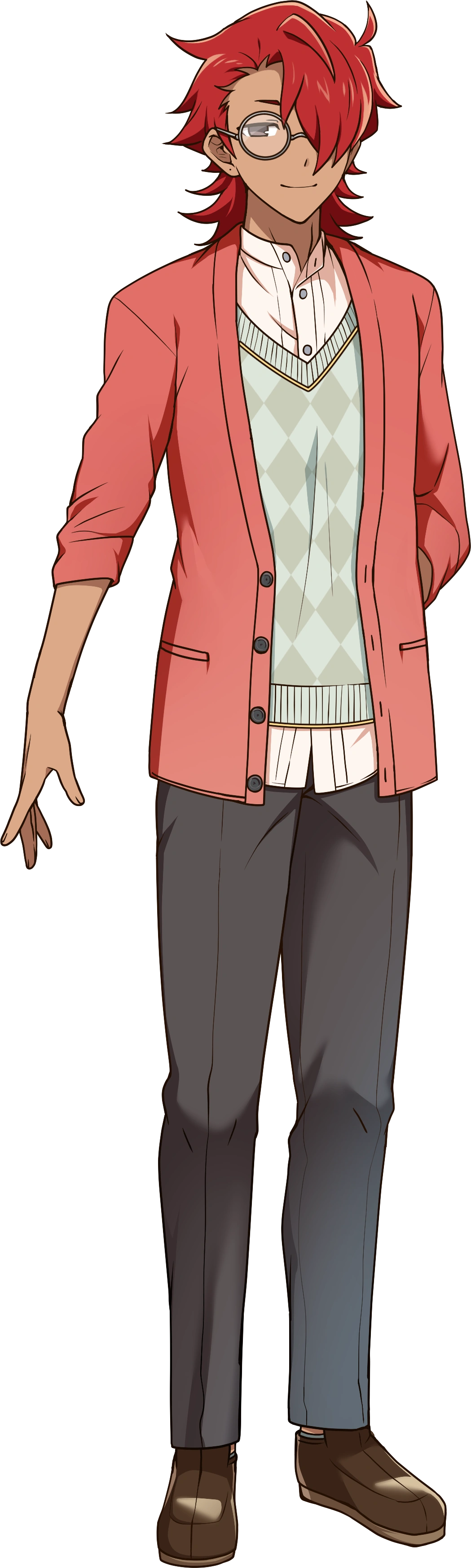 Wakamatsu Akashi (雀松朱司) also known as Suzaku (スザク) is the fourth character revealed from VirVox Project.[28] He is represented by the color red.[17] On January 24, 2022, VirVox Project announced a delay in Akashi's voice and standing art due to the busy schedule of the voice provider,[29] who was later revealed to be Kokuri Raku on July 17 when Akashi's "exVOICE" voice samples were released.[30]